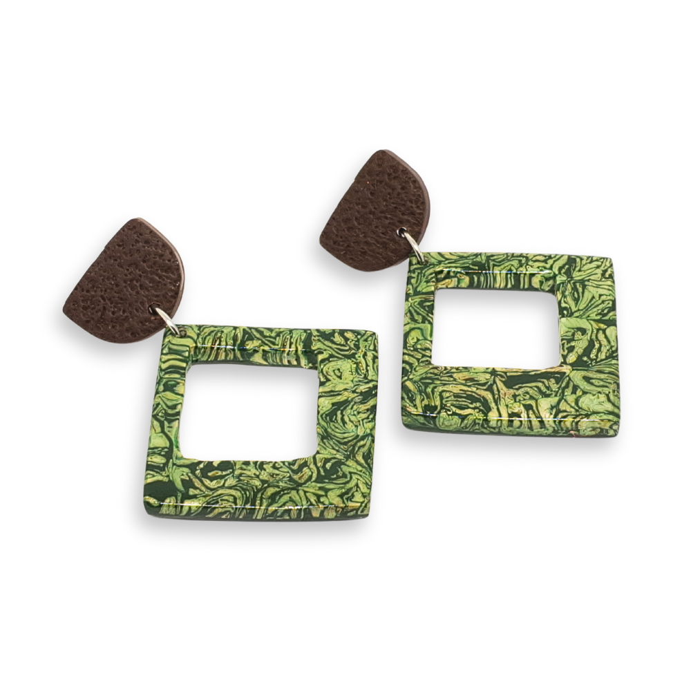 Brinco geométrico em polymer clay nas cores verde e marrom. Leve, expressivo e com textura que remete à natureza.