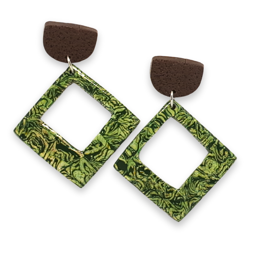 O brinco Folha Seca traz uma combinação elegante entre formas geométricas marcantes e texturas orgânicas. Feito à mão em polymer clay, sua base marrom opaca contrasta com a estrutura vazada em verde vibrante com efeito marmorizado, criando um visual que remete ao entrelaçamento de folhas e musgos.