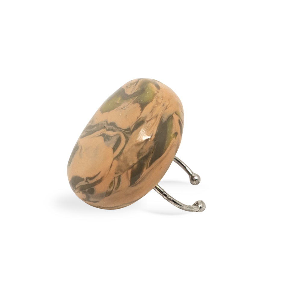 Anel ajustável feito à mão em polymer clay, com acabamento marmorizado em tons nude e verde. Leve, exclusivo e cheio de personalidade.