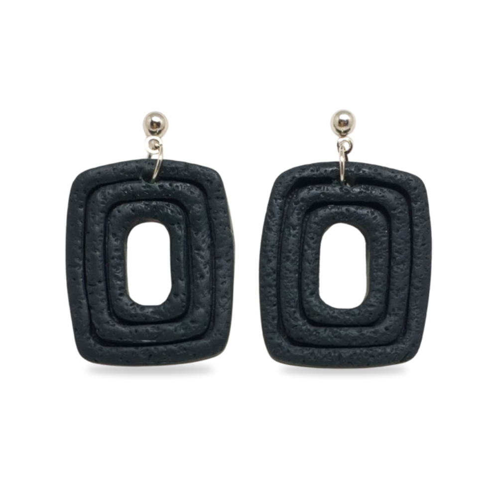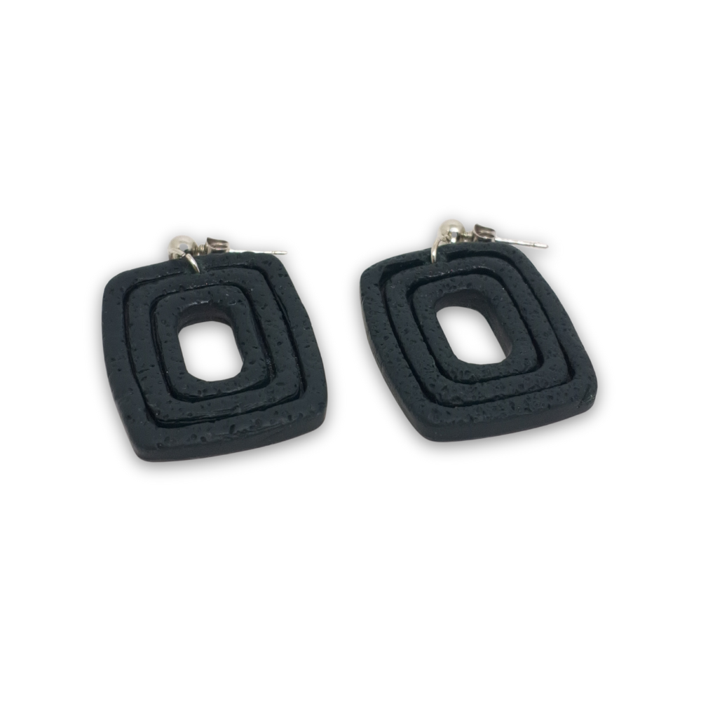 O brinco Ecos traz à tona o poder do espaço e da forma. Feito à mão em polymer clay verde musgo, seu design é composto por camadas retangulares concêntricas que criam profundidade e movimento, mesmo na simplicidade do preto absoluto.