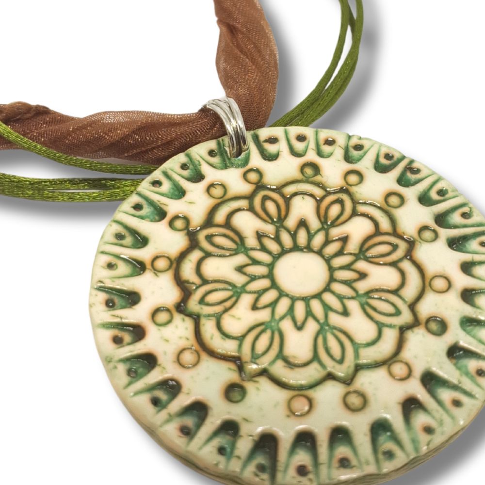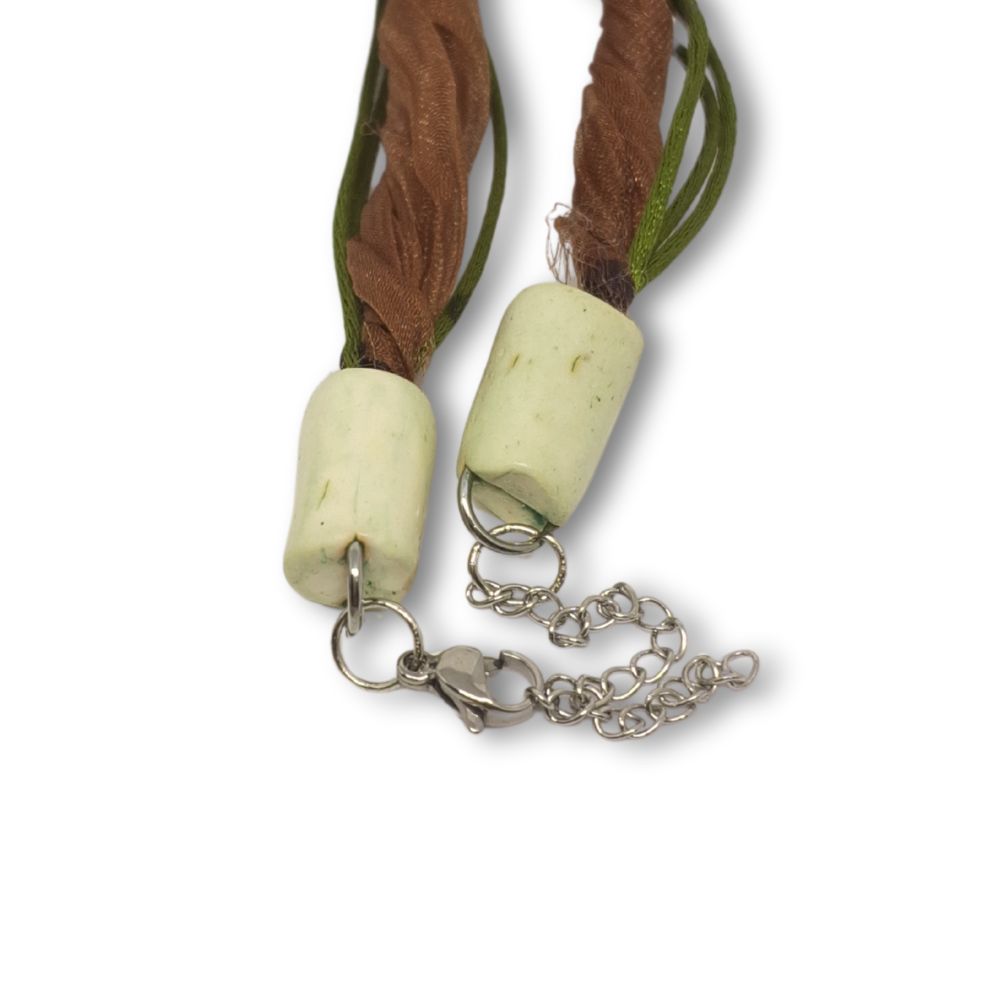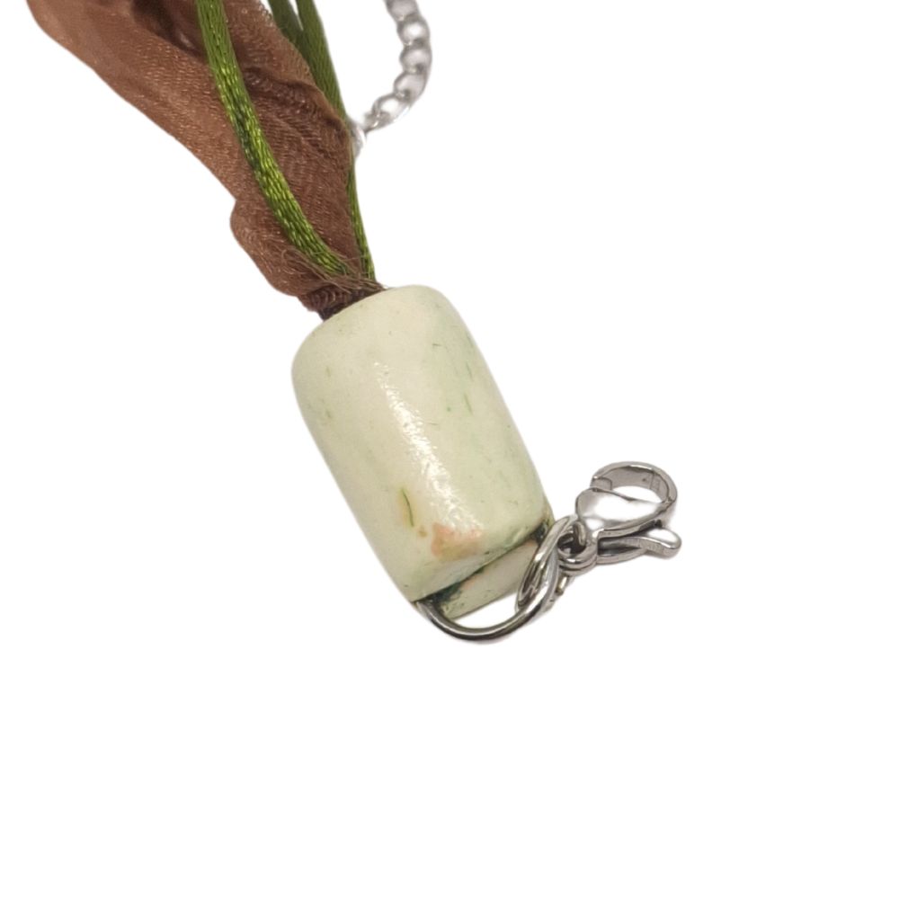Colar feito à mão com pingente em polymer clay, trazendo um trabalho artístico em relevo e acabamento brilhante. O fio combina tiras de tecido marrom e cordões verdes, criando uma proposta rústica e natural. O fecho é em aço inoxidável, com uma corrente extensora de 5 cm que permite ajustar o comprimento conforme o seu estilo.